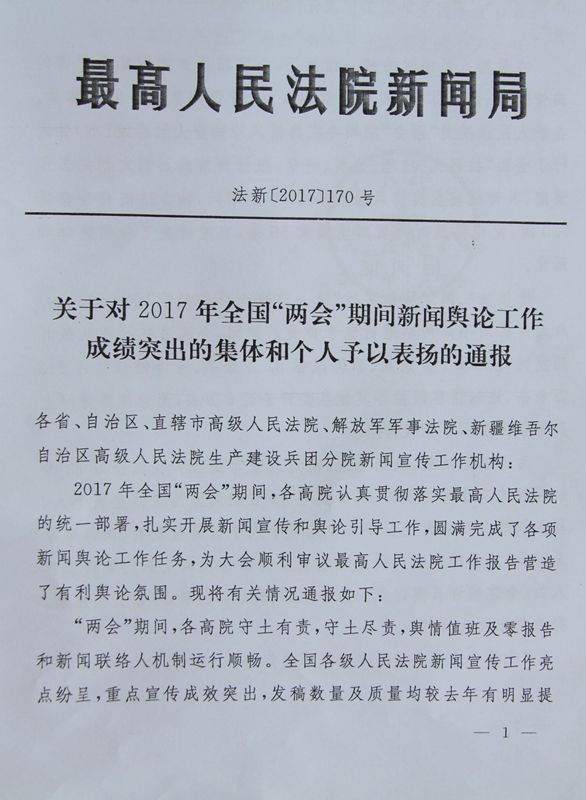 前段时间,最高人民法院新闻局对2017年全国“两会”期间新闻舆论工作成绩突出的集体和个人予以通报表扬,中院刘佳伟同志创新工作,认真完成各项新闻舆论任务,被评为“2017年全国‘两会’舆论引导工作先进个人”。(研究室 供稿)